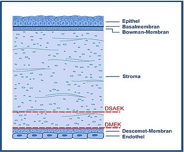 In den letzten 15 Jahren fand eine sprunghafte Entwicklung im Bereich der Hornhauttransplantation statt, die es heutzutage ermöglicht, einzelne Schichten der Hornhaut zu ersetzen. Ein Paradebeispiel dieser Methode ist die DMEK, bei der das Endothel ersetzt wird. Der Oberbegriff dieser Techniken ist die lamelläre Keratoplastik. Bei der lamellären Hornhauttransplantation unterscheidet man grundsätzlich zwischen Operationen, bei denen die Oberfläche und der mittlere Teil der Hornhaut (Epithel und Stroma) ersetzt werden (vordere lamelläre Keratoplastik [DALK]) und Operationen, bei denen nur die innerste Schicht, also das Endothel ersetzt wird (hintere lamelläre Keratoplastik [DMEK und DSAEK]).