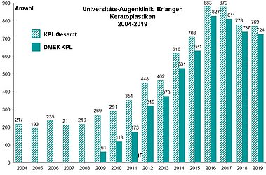 Die Hornhauttransplantation ist die am häufigsten durchgeführte und erfolgreichste Transplantation in der gesamten Medizin. Die Erlanger Universitäts-Augenklinik hat im vergangenen Jahr 778 Hornhauttransplantationen (Keratoplastiken) durchgeführt und ist damit führend in Deutschland und in Europa. Damit nehmen wir auf diesem Gebiet in Europa und weltweit mit Abstand die Spitzenposition ein. Insbesondere kommen an unserer Klinik die modernen Verfahren der schichtweisen Hornhautübertragung (DMEK, DSAEK und DALK) zum Einsatz. Bislang haben wir über 6000 Hornhauttransplantationen nach diesem modernen Verfahren durchgeführt.