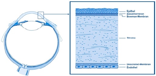 Die Hornhaut ist ein klares durchsichtiges Scheibchen mit einem Durchmesser von 11 mm. Sie ist nur ½ mm dick. Wie bei einer Fensterscheibe unterscheidet man auch bei der Hornhaut eine Außenschicht, einen mittleren Teil und eine Innenschicht. In der Fachsprache bezeichnet man die Außenschicht als das Epithel, die mittlere Schicht als das Stroma und die innere Schicht als das Endothel. Das Besondere an der Endothelzellschicht ist, dass sie kleine Pumpen besitzt, die Wasser aus der Hornhaut herauspumpen. Nur, wenn diese Pumpen funktionieren, kann man klar sehen. Die Endothelzellen sitzen auf einem papierdünnen Häutchen, der so genannten Descemt’schen Membran.